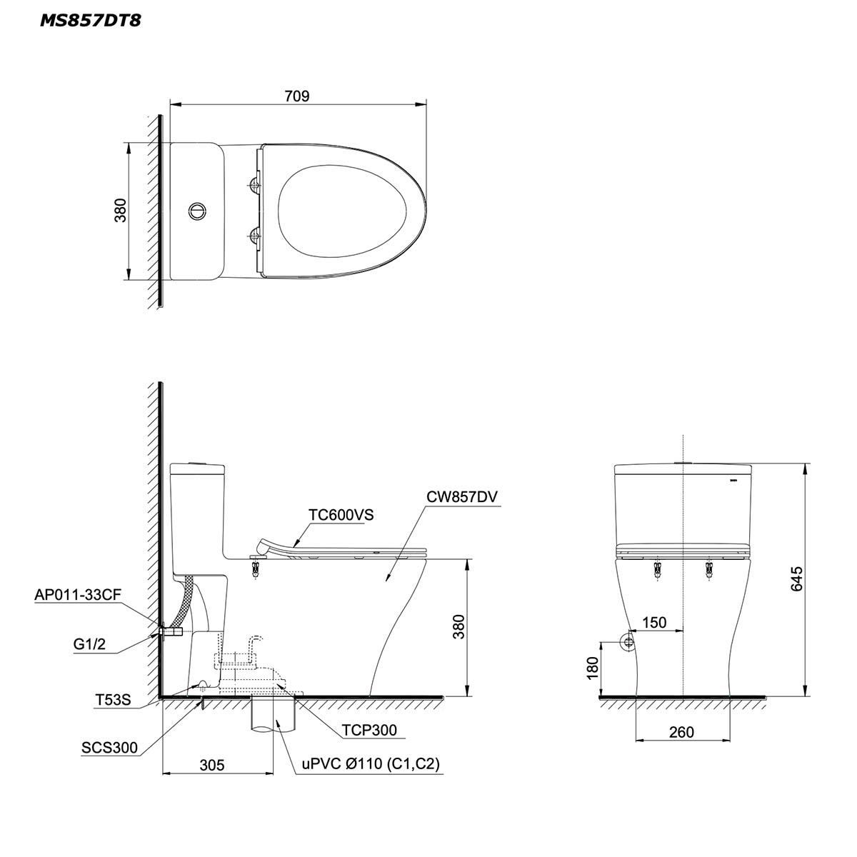 Bản vẽ kĩ thuật Bồn cầu 1 khối TOTO MS857DT8 nắp êm TC600VS