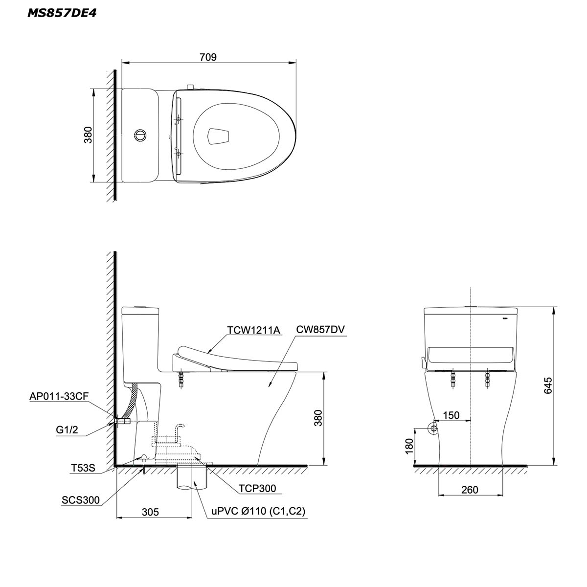 Thông số kĩ thuật Bồn cầu thông minh TOTO MS857DE4 nắp rửa cơ TCW1211A