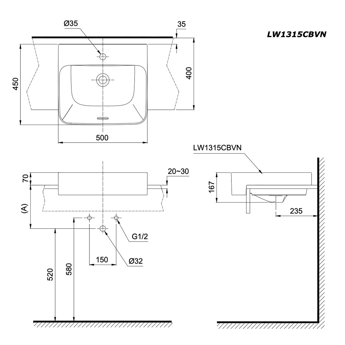 Bản vẽ kĩ thuật Chậu lavabo bán âm TOTO LW1315CBVN