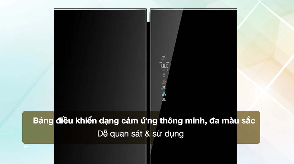 Tủ lạnh Aqua AQR-M727XA(GB)U1 sở hữu thiết kế 4 cánh hiện đại với mặt gương vân đá cẩm thạch màu đen bóng, mang lại vẻ đẹp sang trọng cho không gian bếp. Mặt gương không chỉ tạo điểm nhấn thẩm mỹ mà còn dễ dàng vệ sinh, giữ cho tủ luôn sạch sẽ. Tay nắm cửa được làm từ hợp kim nhôm chắc chắn, chống gỉ sét và tăng tính thẩm mỹ cho sản phẩm. Bảng điều khiển cảm ứng đa sắc màu được bố trí bên ngoài cửa tủ, cho phép người dùng dễ dàng điều chỉnh các chức năng mà không cần mở cửa, giúp tiết kiệm điện năng và duy trì nhiệt độ ổn định bên trong.