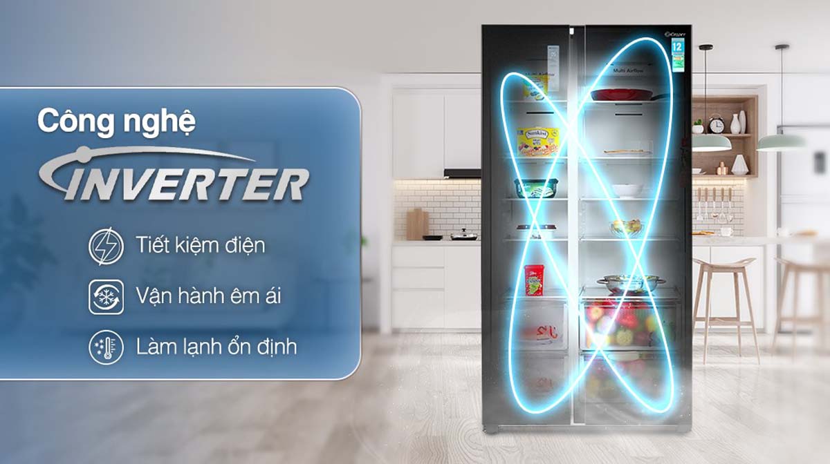 Hệ thống Multi Air Flow phân phối khí lạnh đều khắp các ngăn tủ, đảm bảo thực phẩm được làm lạnh đồng đều và duy trì độ tươi ngon lâu hơn. Công nghệ này giúp ngăn ngừa tình trạng thực phẩm bị hư hỏng do nhiệt độ không đồng đều, đồng thời tiết kiệm điện năng bằng cách giảm thiểu hoạt động của máy nén.