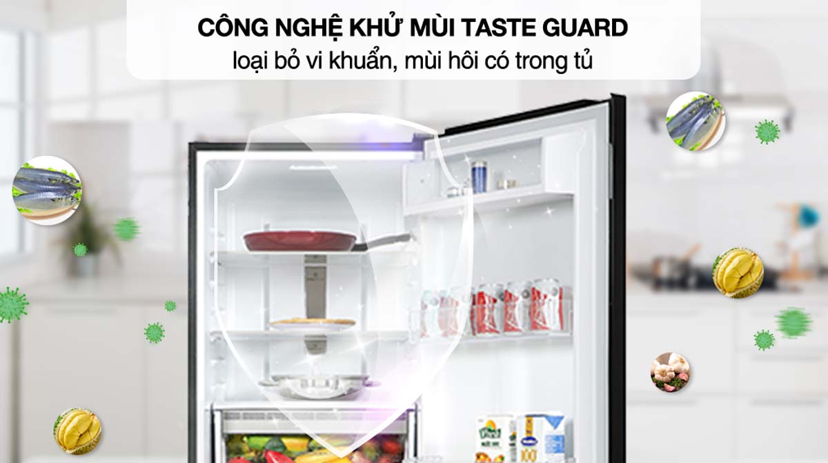 Công nghệ TasteGuard với bộ lọc than hoạt tính giúp khử mùi và diệt khuẩn, giữ cho tủ lạnh luôn tươi mát, sạch khuẩn và không có mùi khó chịu.