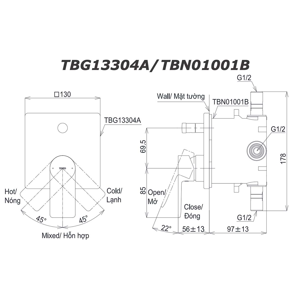 Bản vẽ kỹ thuật Van gật gù TOTO TBG13304A TBN01001B sen âm tường GT