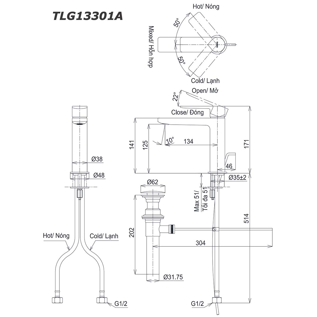 Bản vẽ kỹ thuật Vòi lavabo TOTO TLG13301A nóng lạnh GT