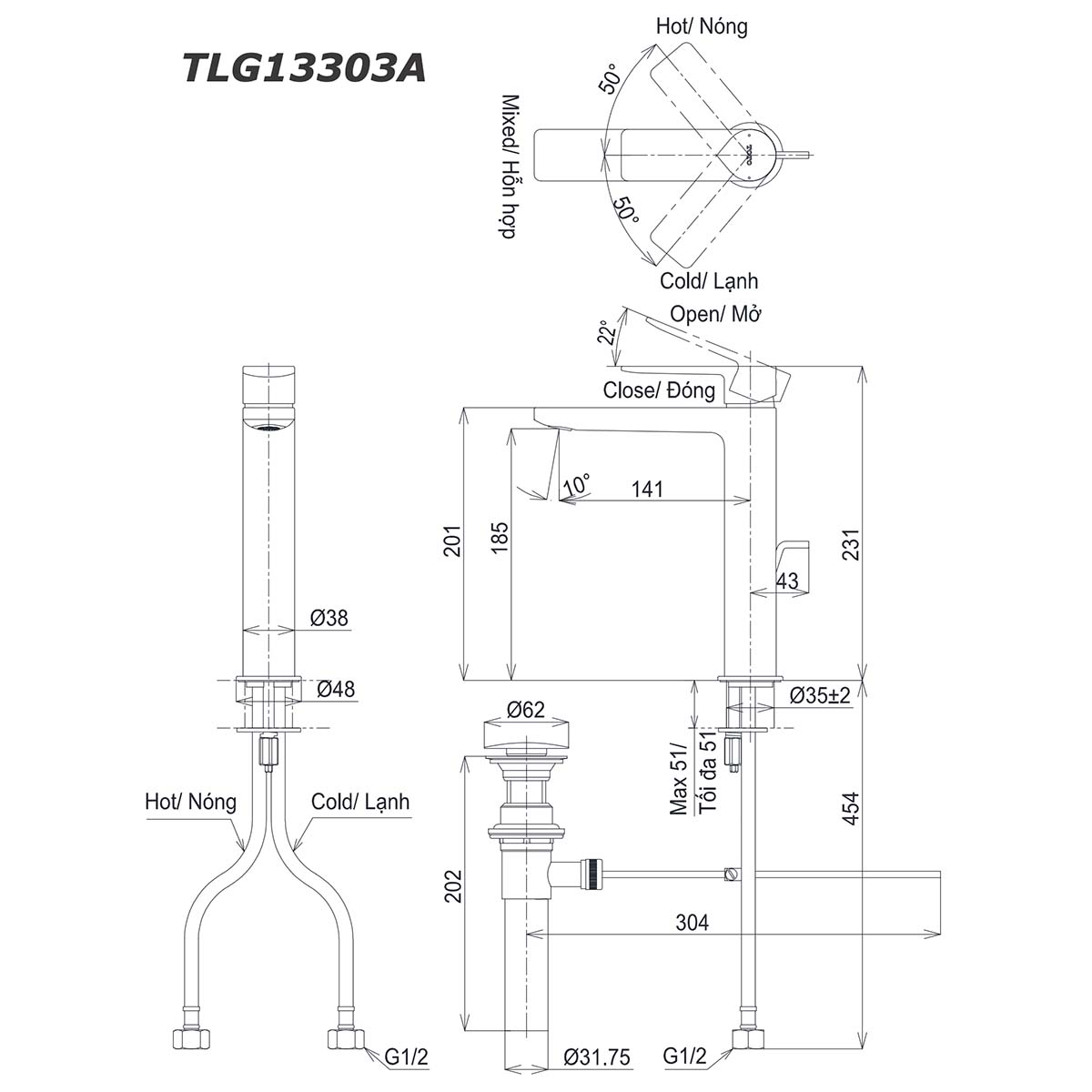 Bản vẽ kỹ thuật Vòi lavabo TOTO TLG13303A cổ cao nóng lạnh GT