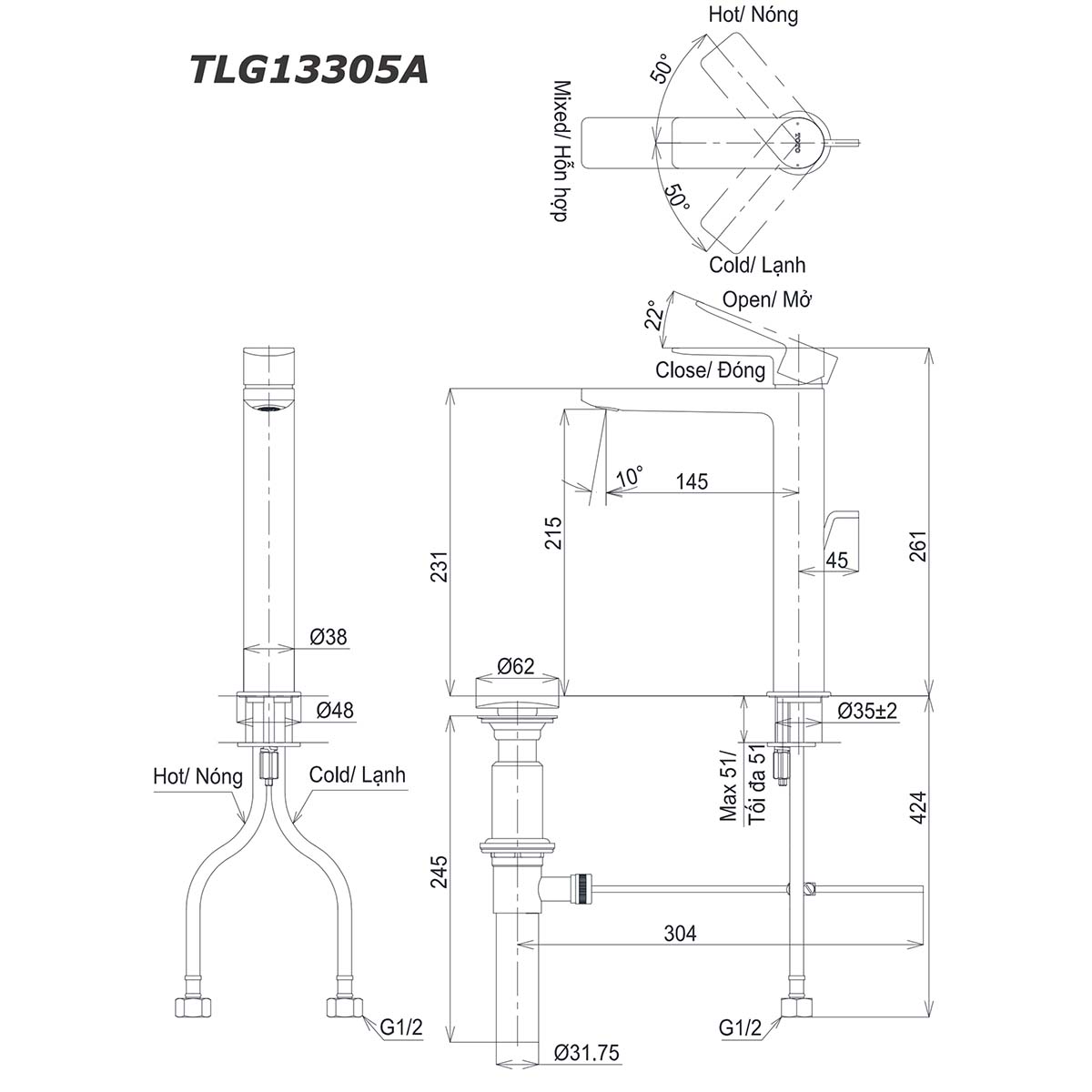 Bản vẽ kỹ thuật Vòi lavabo TOTO TLG13305A cổ cao nóng lạnh GT