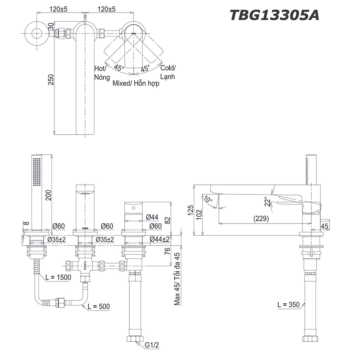 Bản vẽ kỹ thuật Vòi sen bồn tắm TOTO TBG13305A gắn bồn 3 lỗ GT nóng lạnh