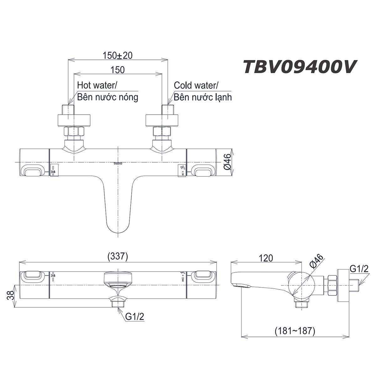 Bản vẽ kỹ thuật Vòi sen tắm TOTO TBV09400V nhiệt độ